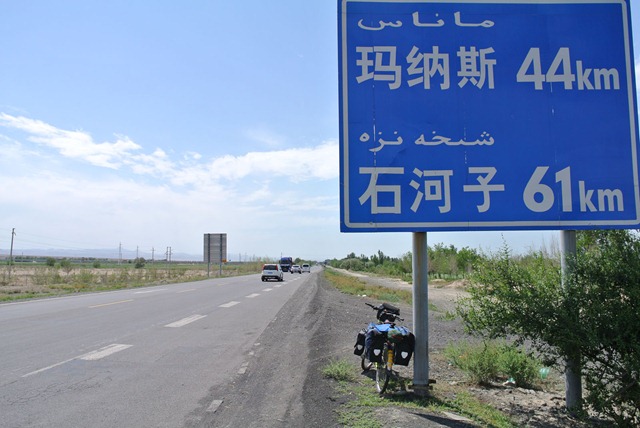 很久沒上路了今天騎在路上心情特別好,加上一路順風幫忙怎樣騎都不怎麼累;過了烏魯木齊後沿路景觀不再是戈壁灘,變成大都是有人耕種的農地,大部分要歸功於新疆的兵團,有點類似台灣的榮民,經過多年兵團部隊的墾荒使得新疆部分地區的土地適宜耕種,在戈壁灘中闢荒引水灌溉的辛苦可想而知;